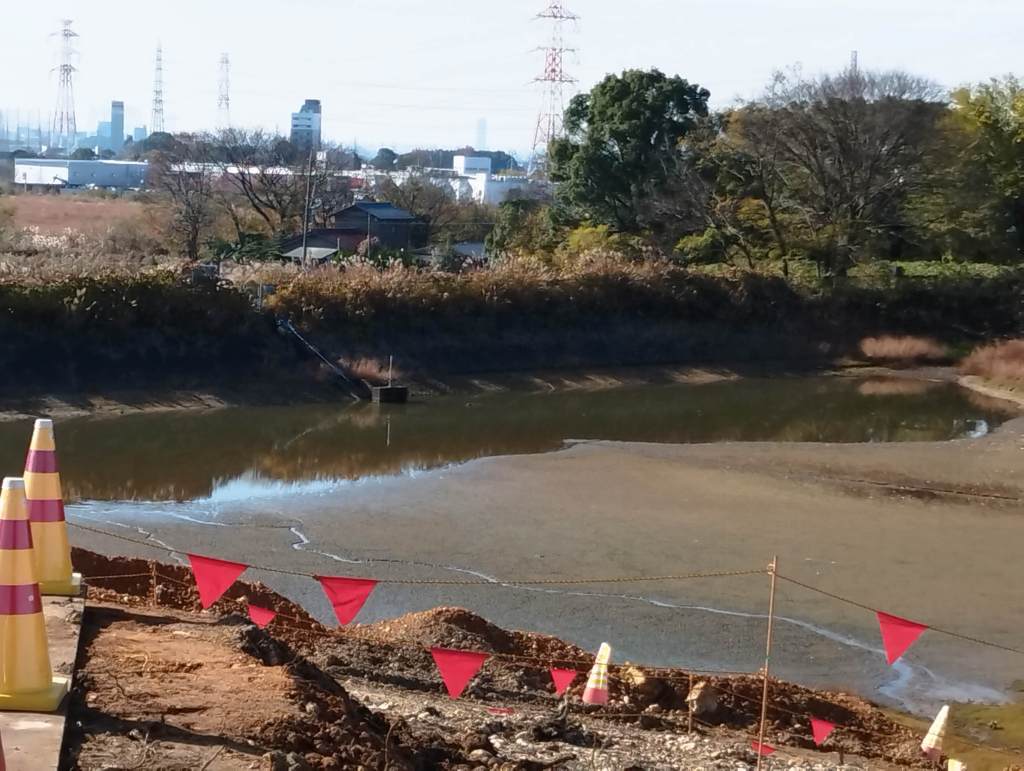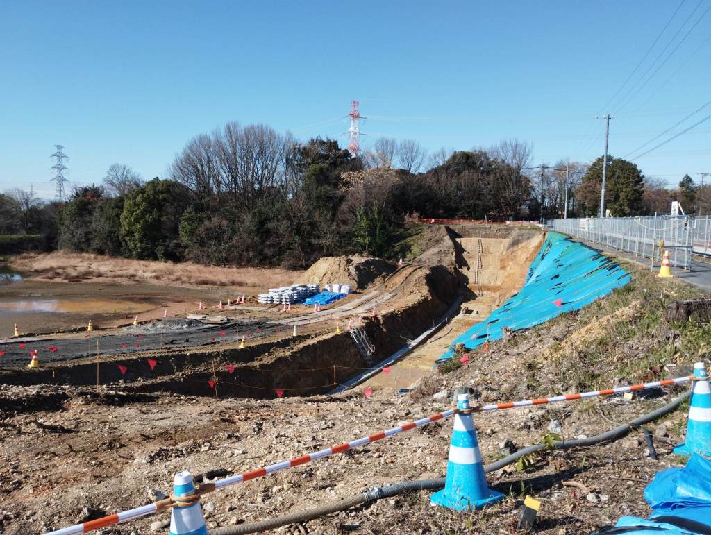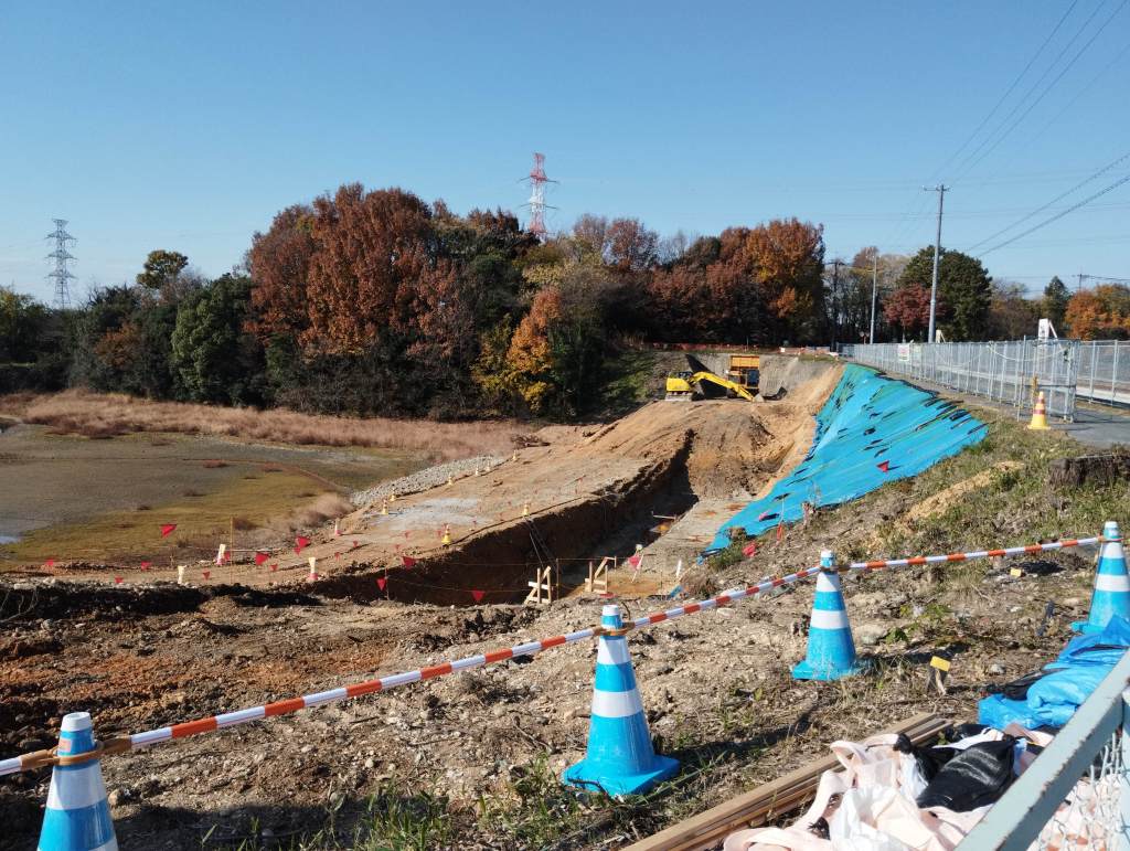 池の堤防の下を掘っています。基礎を固めて、頑丈な斜面をつくるのでしょうか。