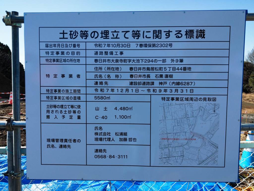 現場に設置されていた標識。搬入する土砂について書かれていました。C-40は40㎜以下の砕石のことだそう。山土で盛った上に、C-40で締め固めるのでしょうか。